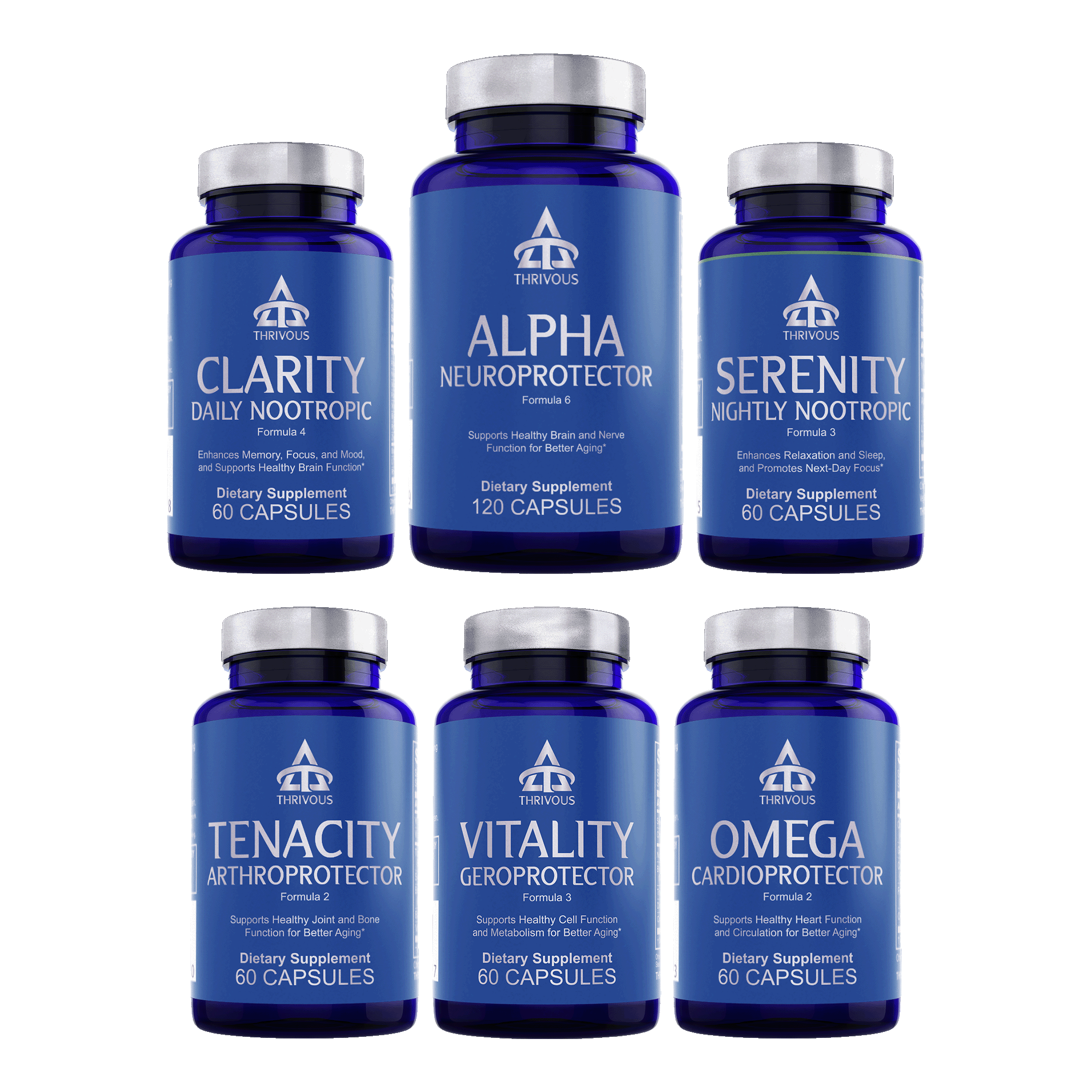 Thrivous Stack is an advanced supplement to enhance memory, focus, and sleep, as well as brain, heart, joint, and cell function for better aging. Each is a month supply (420 capsules) of the best natural nootropics and geroprotectors, with clinical doses of Alpha GPC, Bacopa, Berberine, Theanine, Omega 3, and Turmeric.